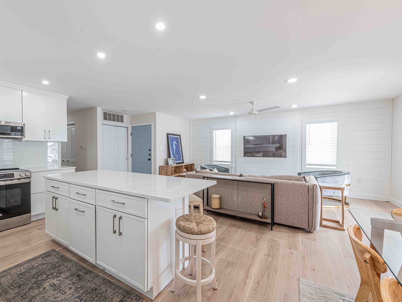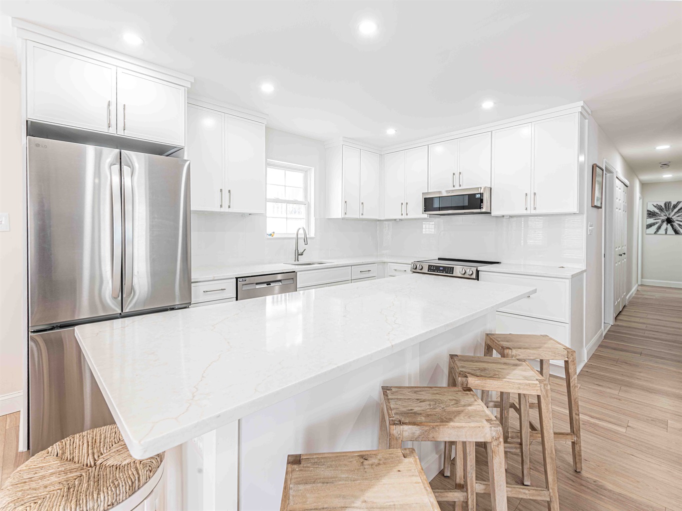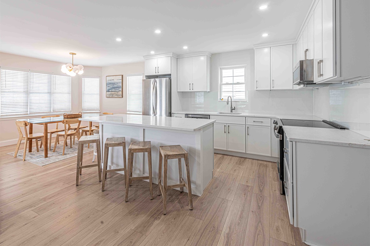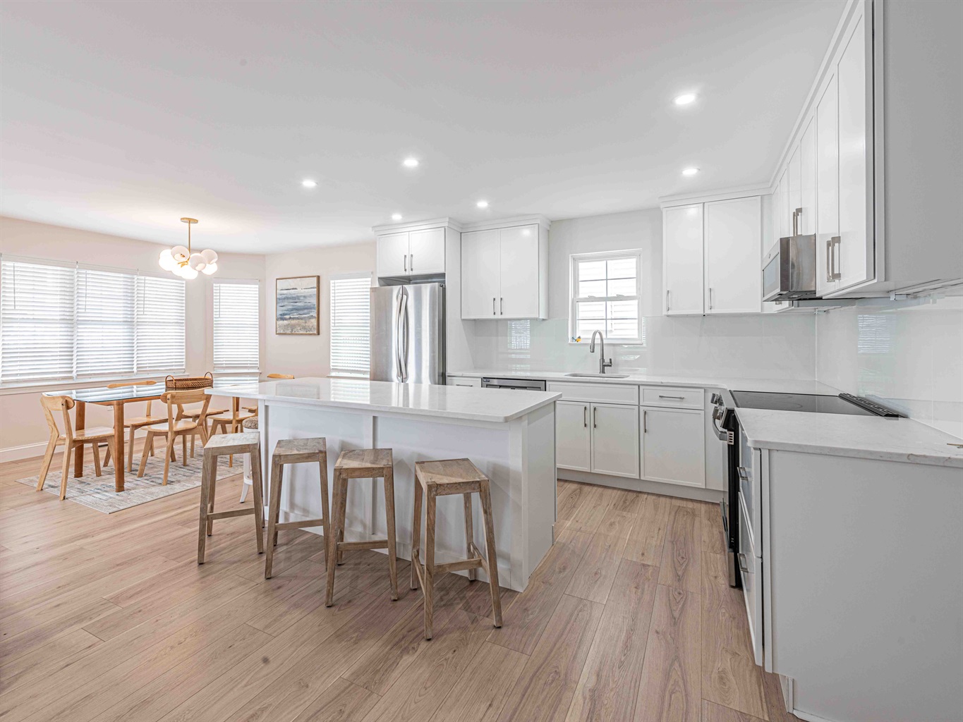 Recently updated with high-end finishes, this 3-bedroom, 2-bath home blends modern comfort with classic shore charm. The open-concept living space features stylish flooring, a gourmet kitchen with quartz countertops, and a large center island—perfect for morning coffee or post-beach gatherings.