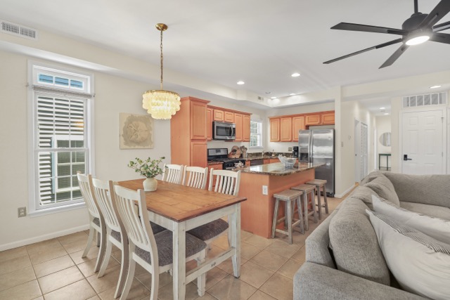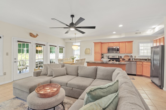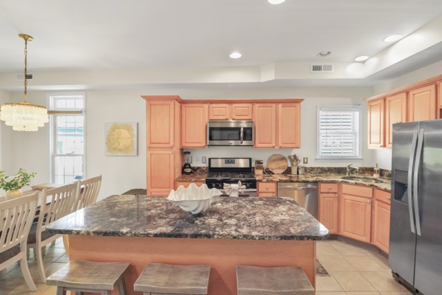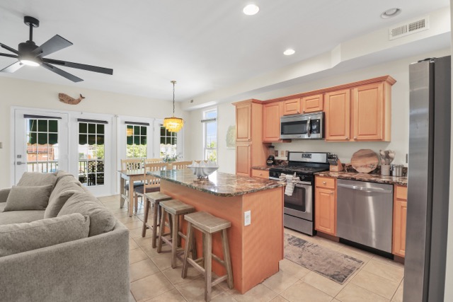 Inside, the space welcomes you with central air conditioning and an open, inviting living area designed for connection. Whether you’re watching a movie, sipping morning coffee by the window, or curling up on the sleeper sectional, this home is perfect for families and groups. The fully equipped kitchen makes it easy to prepare seaside brunches or sunset dinners after a day in the sun.
