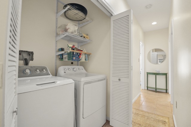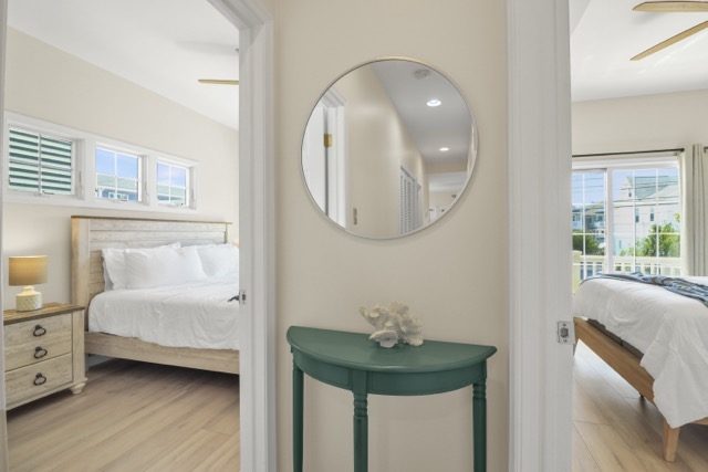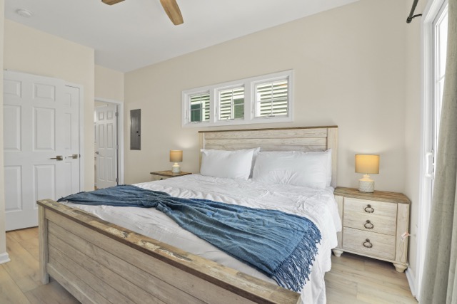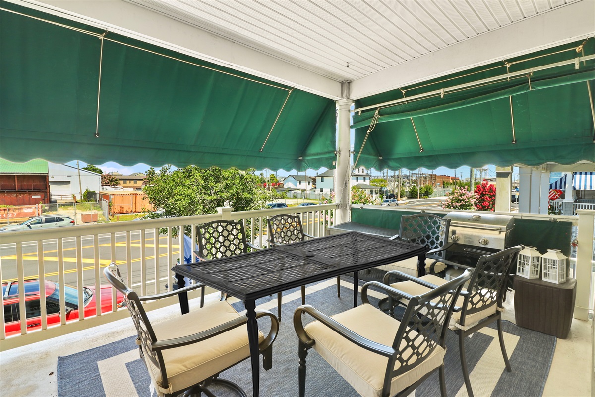 Step outside to the awning-covered deck, where soft seating and golden skies create the perfect setting for evening cocktails, lazy afternoons, or simply soaking in the salty ocean air. After a beach day, rinse off and grab your gear from the garage—fully stocked with beach chairs, carts, and extra essentials to make your stay effortless.