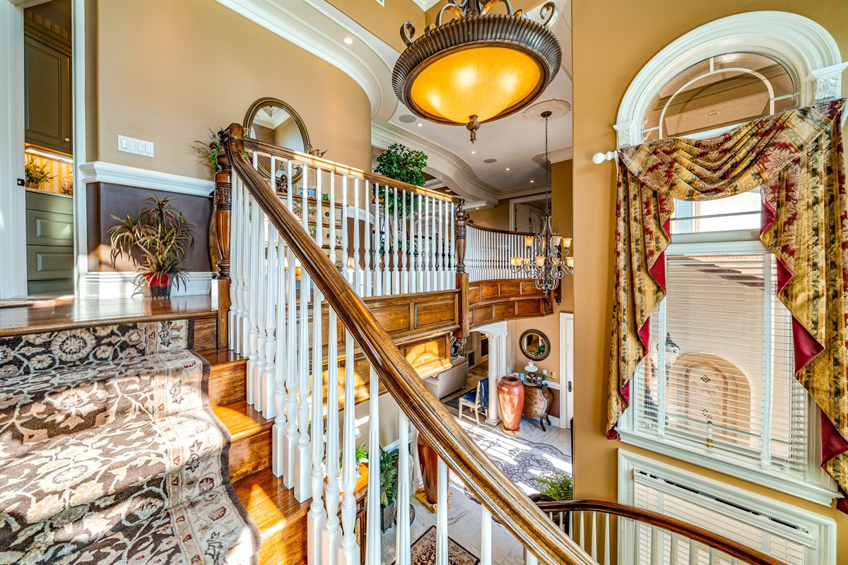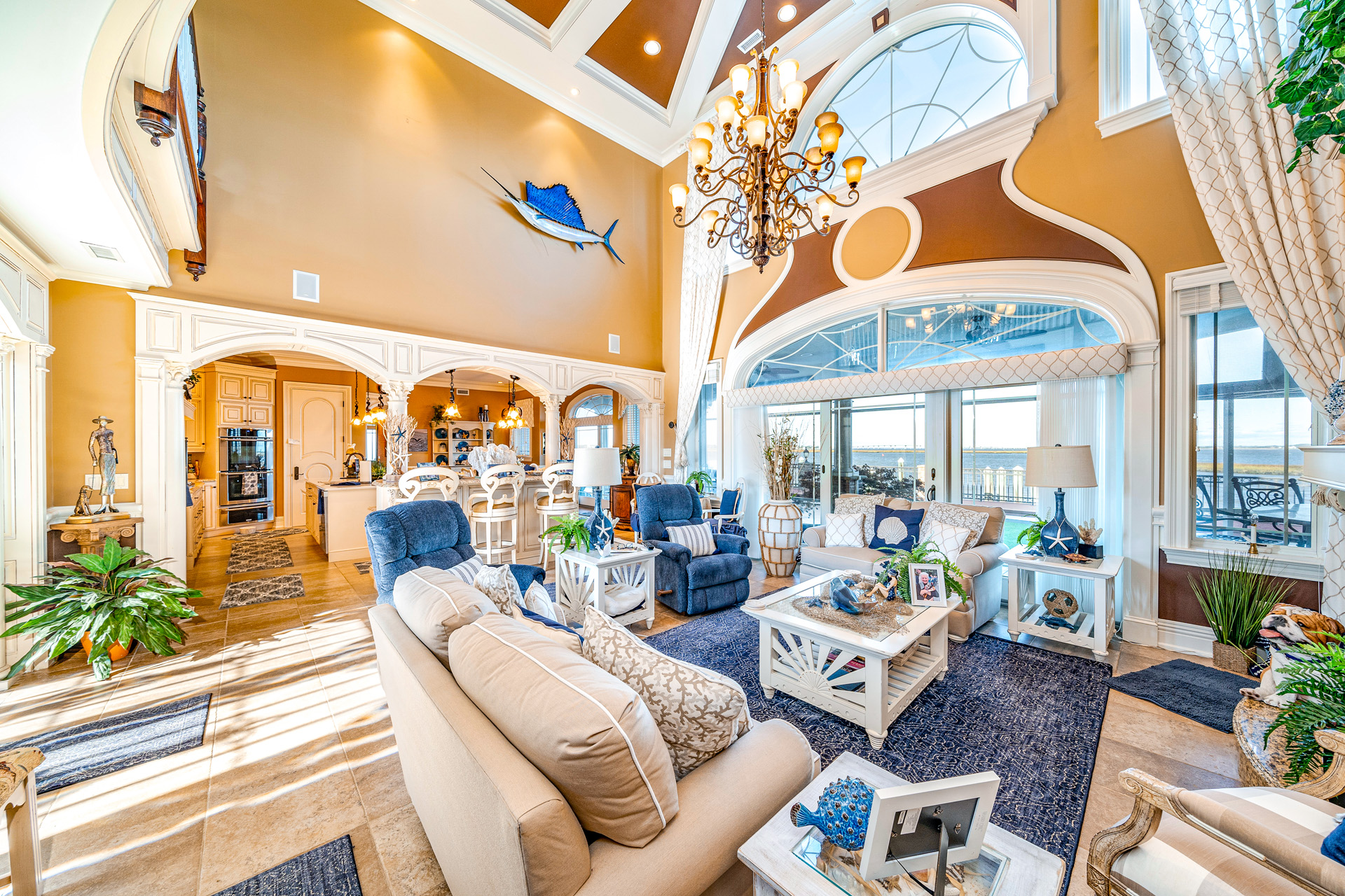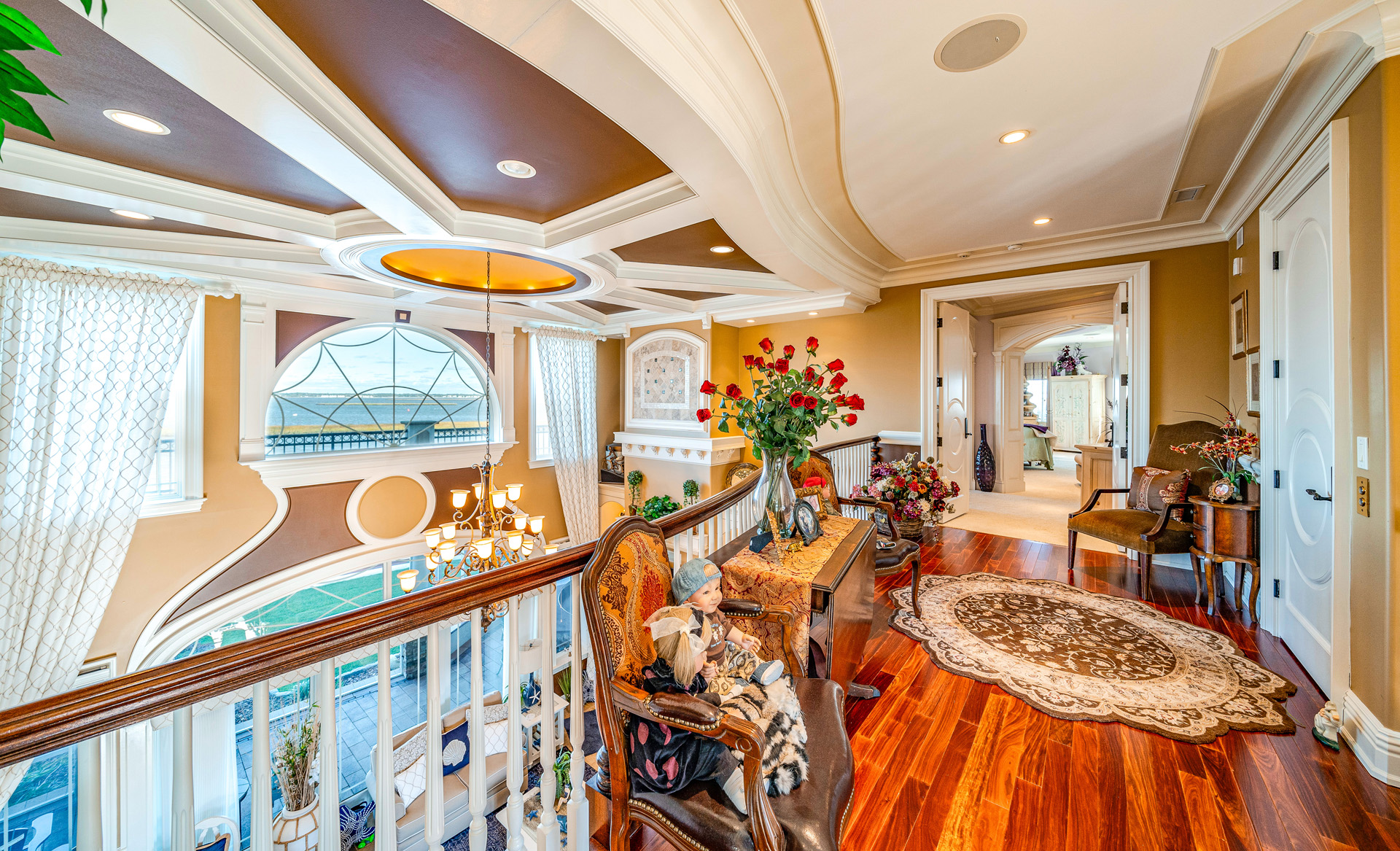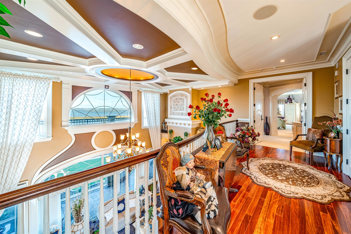 From the moment you enter the grand foyer, soaring double-height ceilings and timeless architectural details define every space. Rich Brazilian cherry wood floors, radiant heated tile, and intricate trim work create an ambiance of refined warmth. The heart of the home—the magnificent living room—features coffered ceilings, walls of glass, and views that frame the bay like a masterpiece.