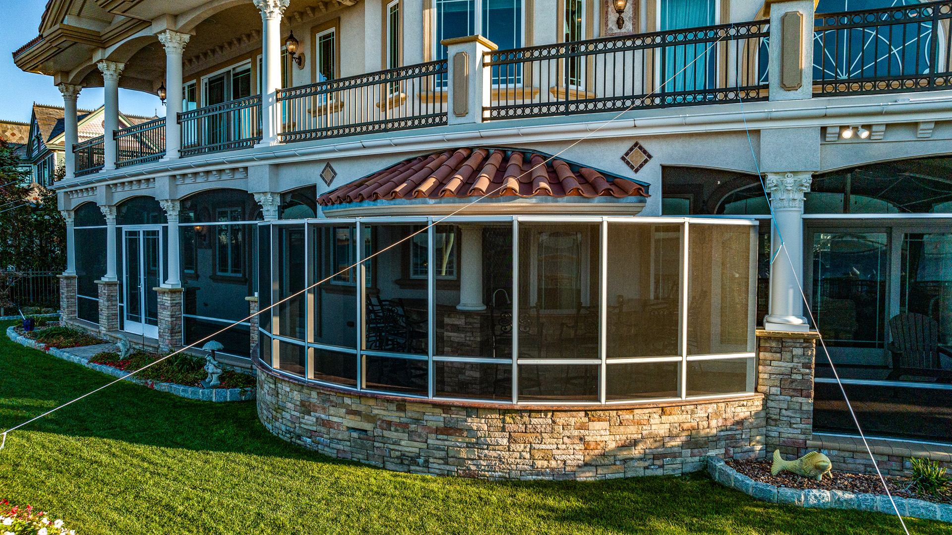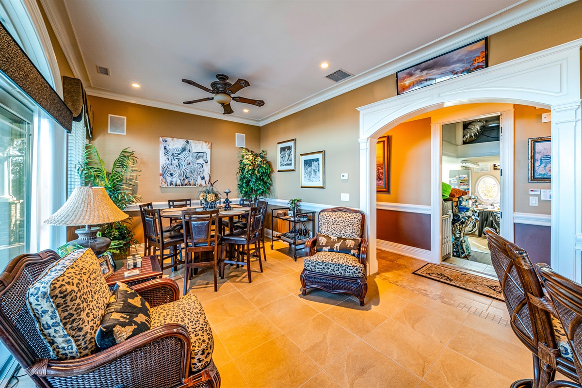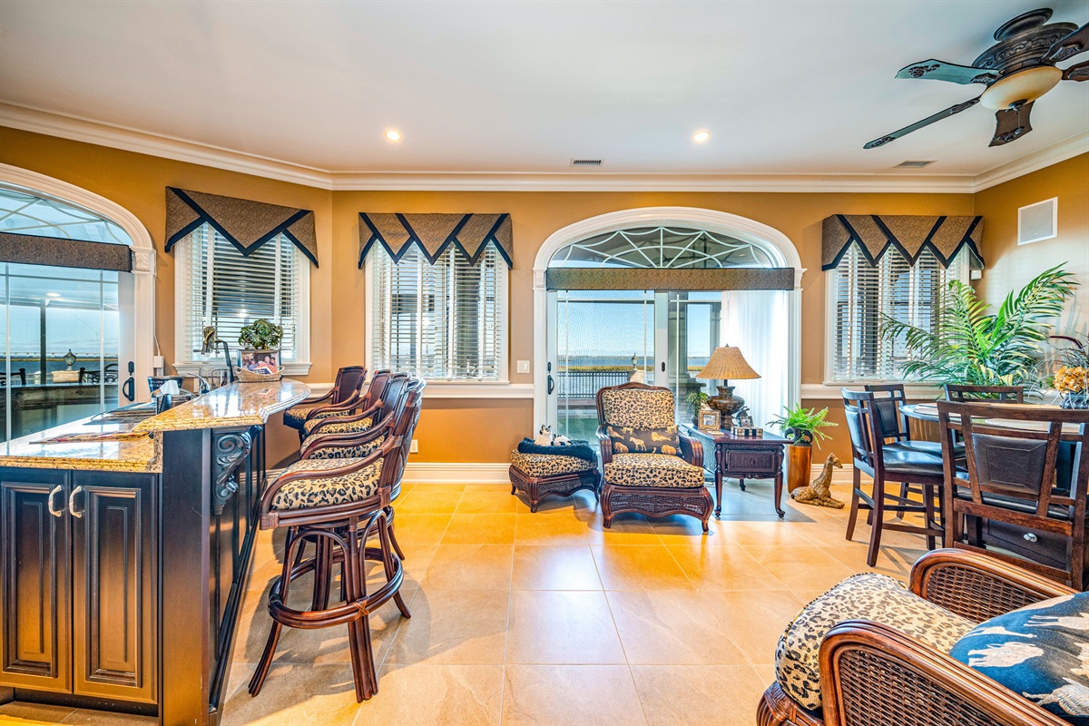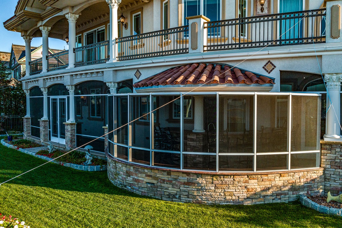 Screened-in porch spanning 120 ft. w/ bar & lounge area