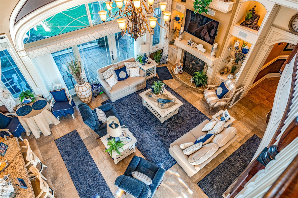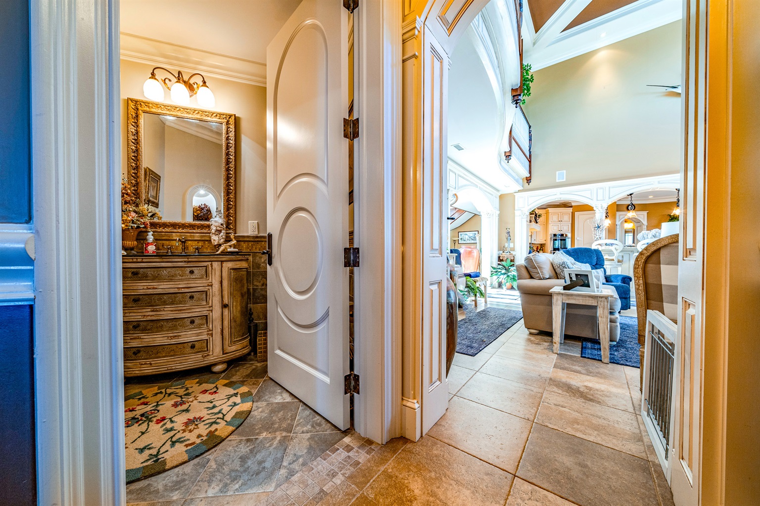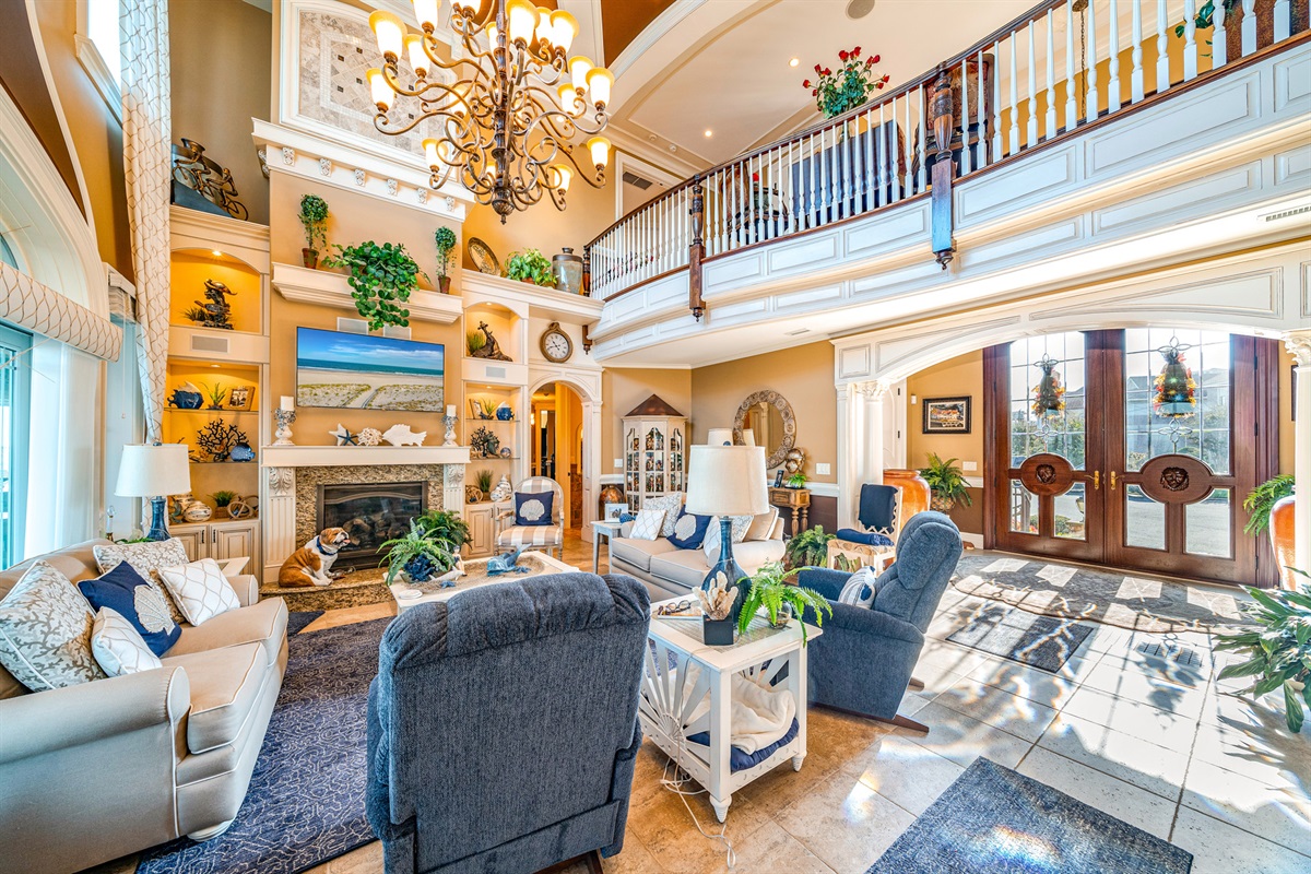 Grand foyer + double-height living room w/ coffered ceilings