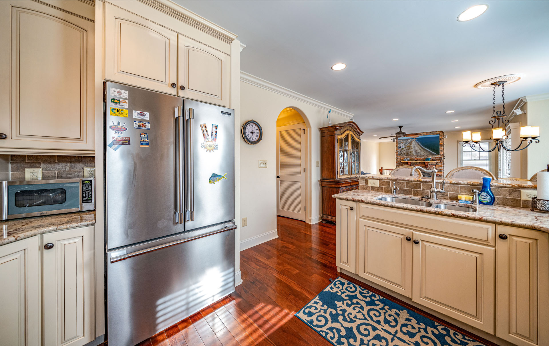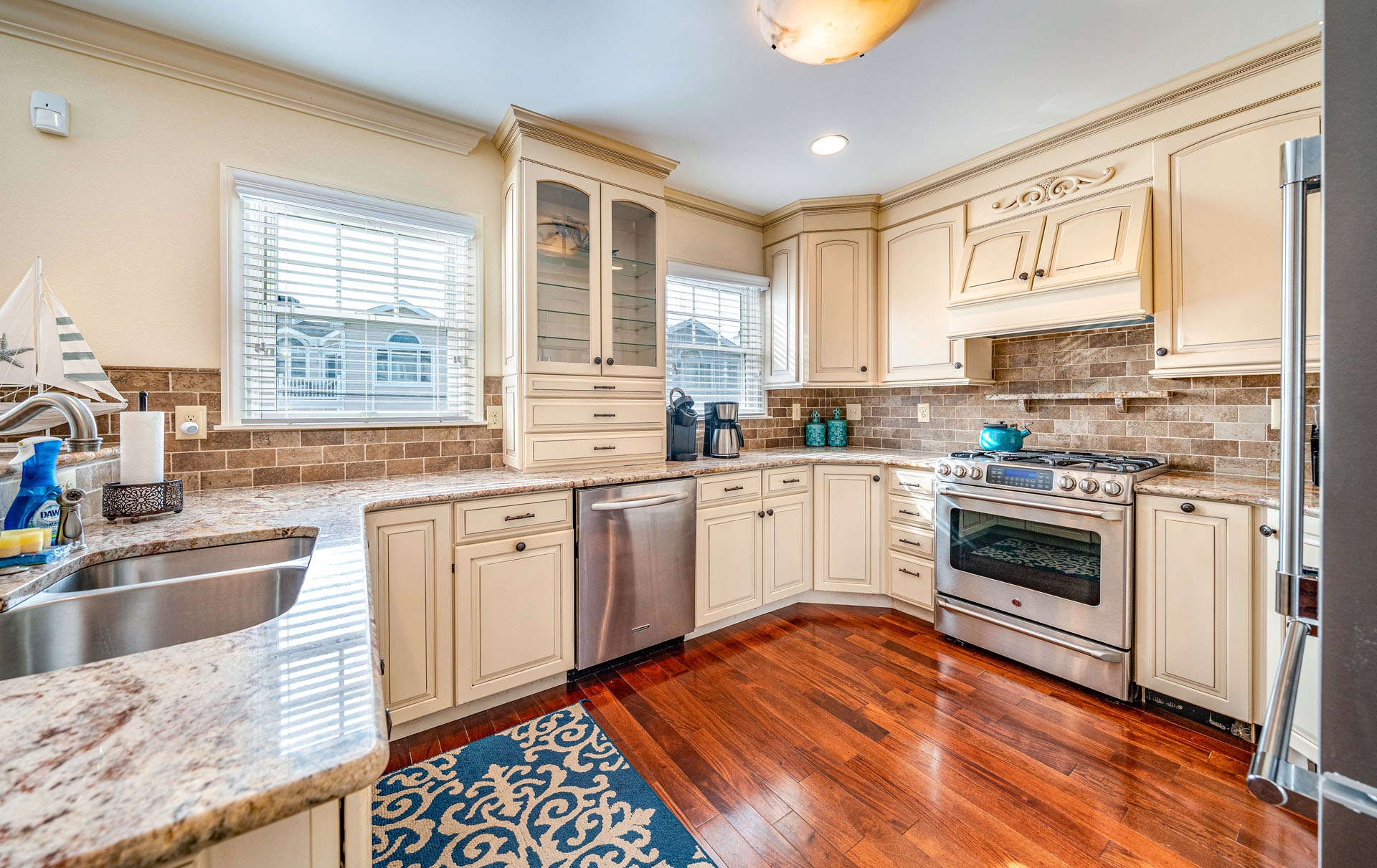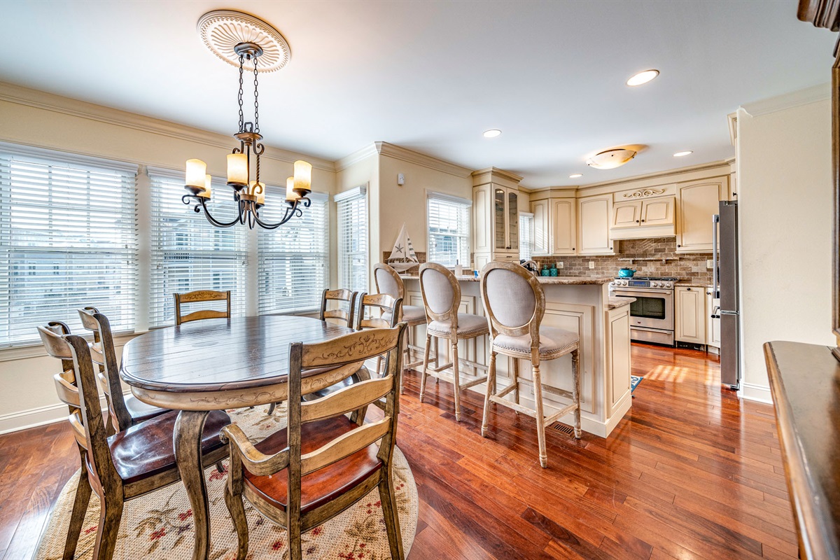 Brazilian hardwood floors, crown molding, granite countertops, tiled backsplash