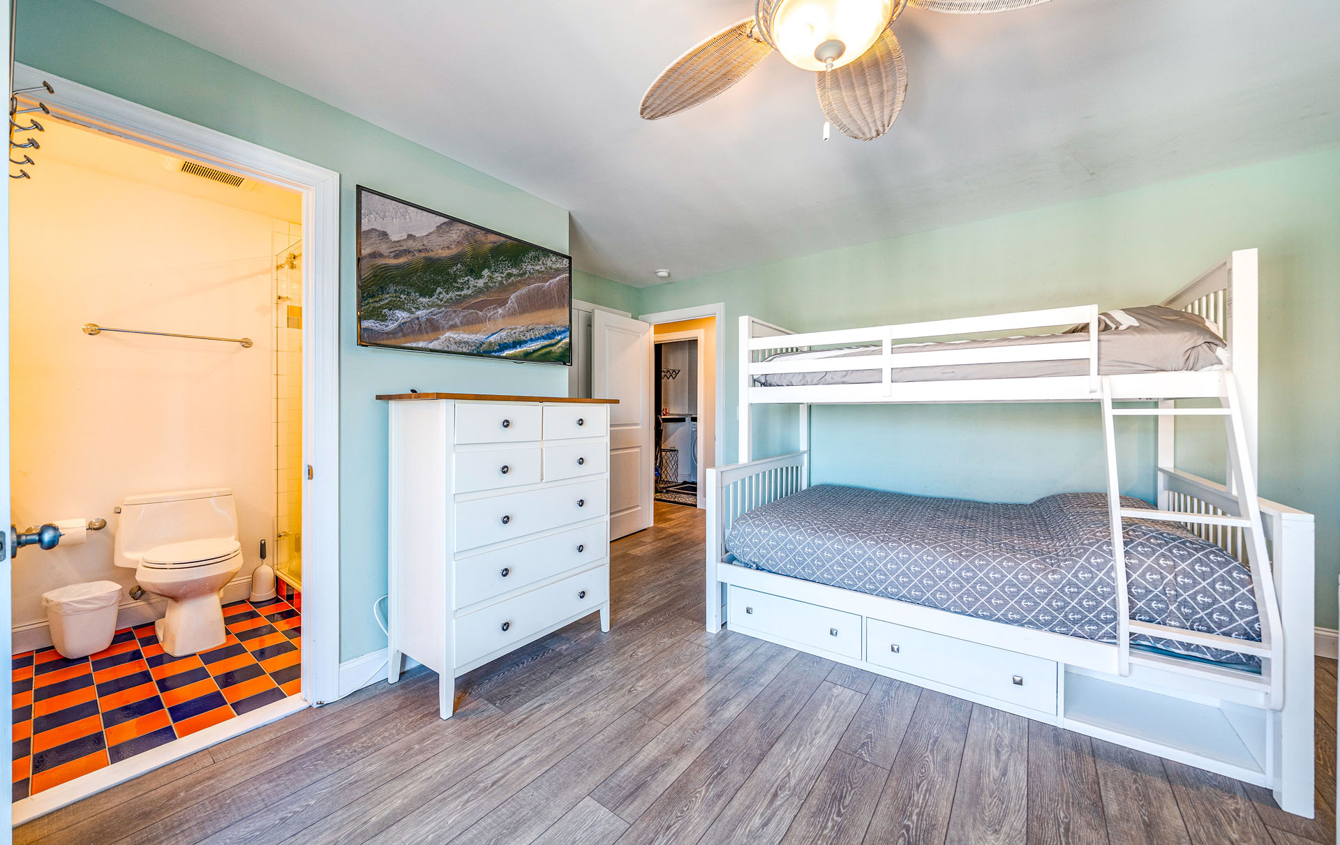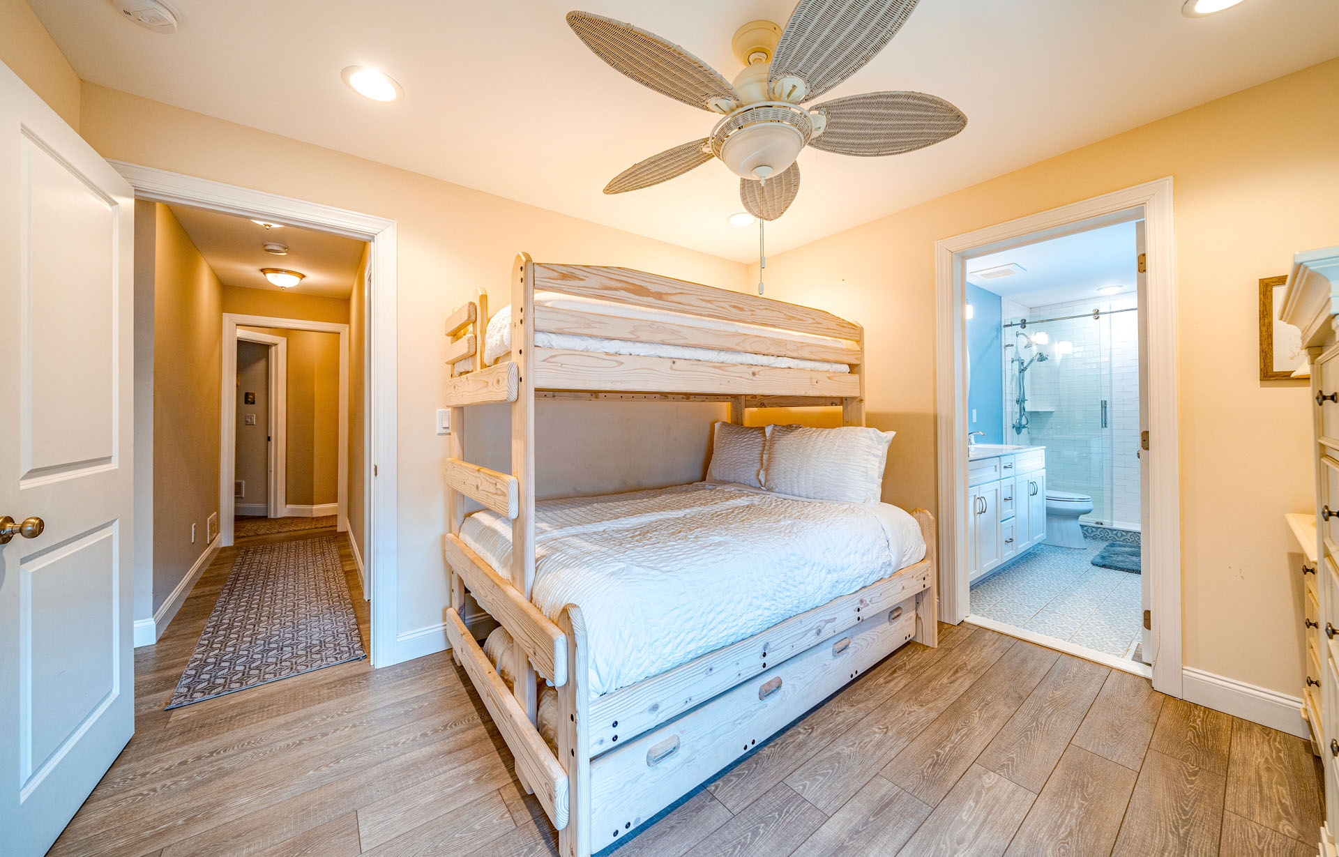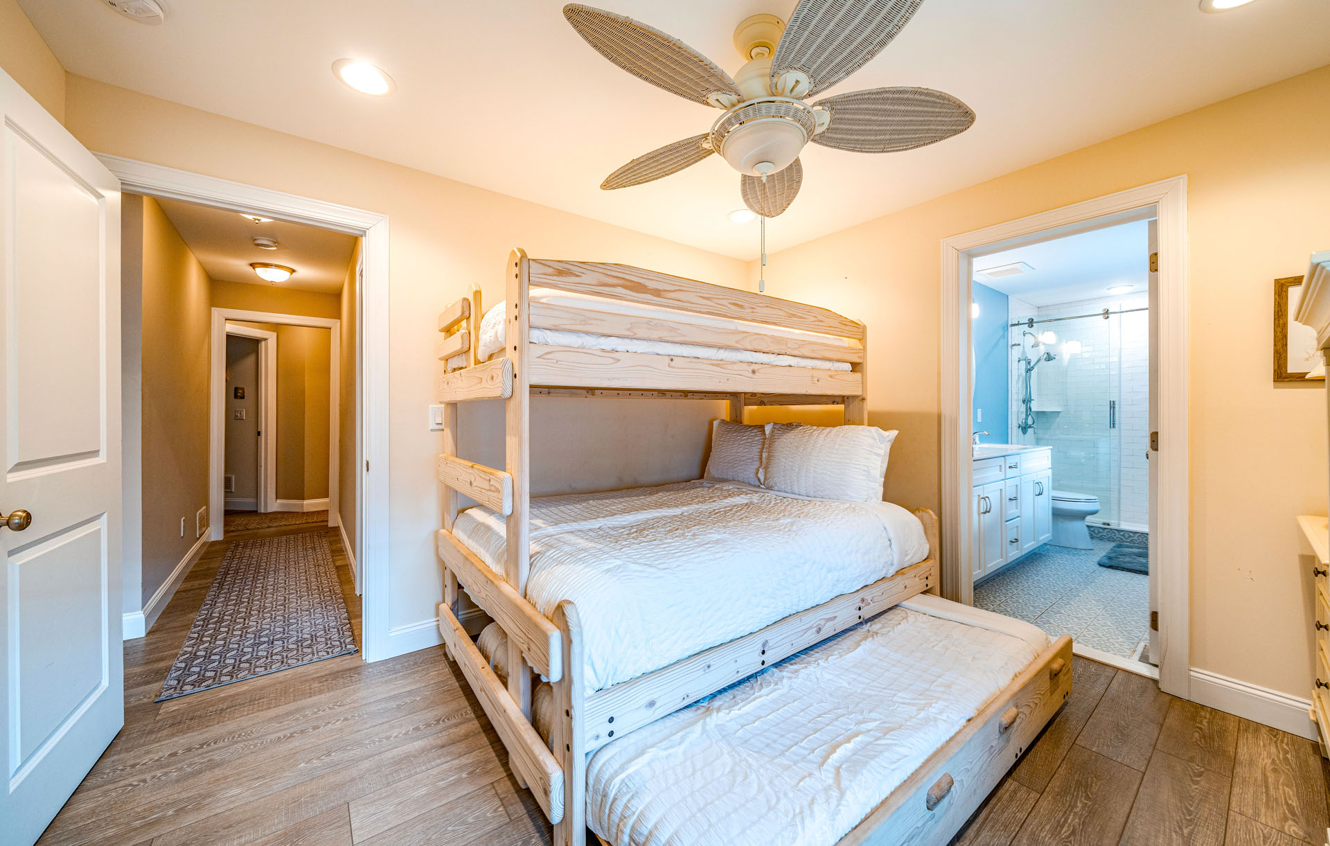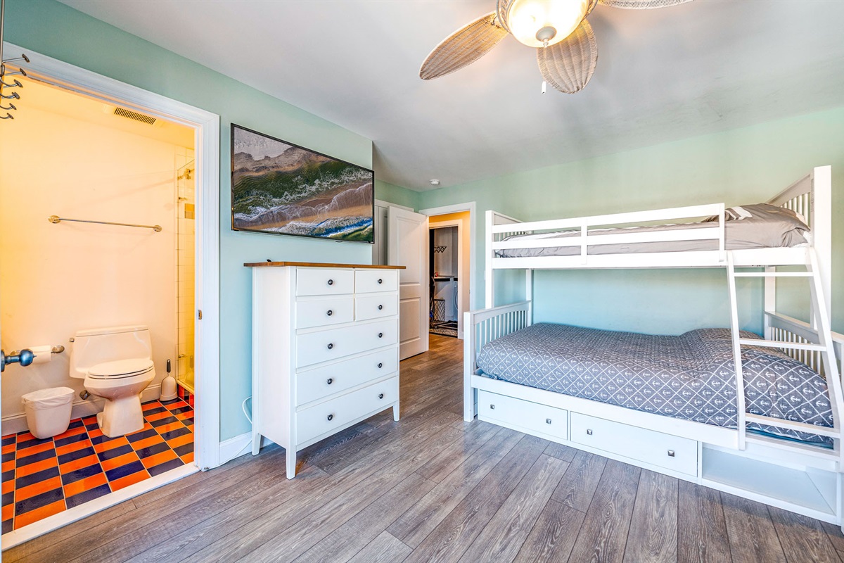 BR 6: Two twin-over-full bunks + trundle (sleeps 7) w/ attached bath