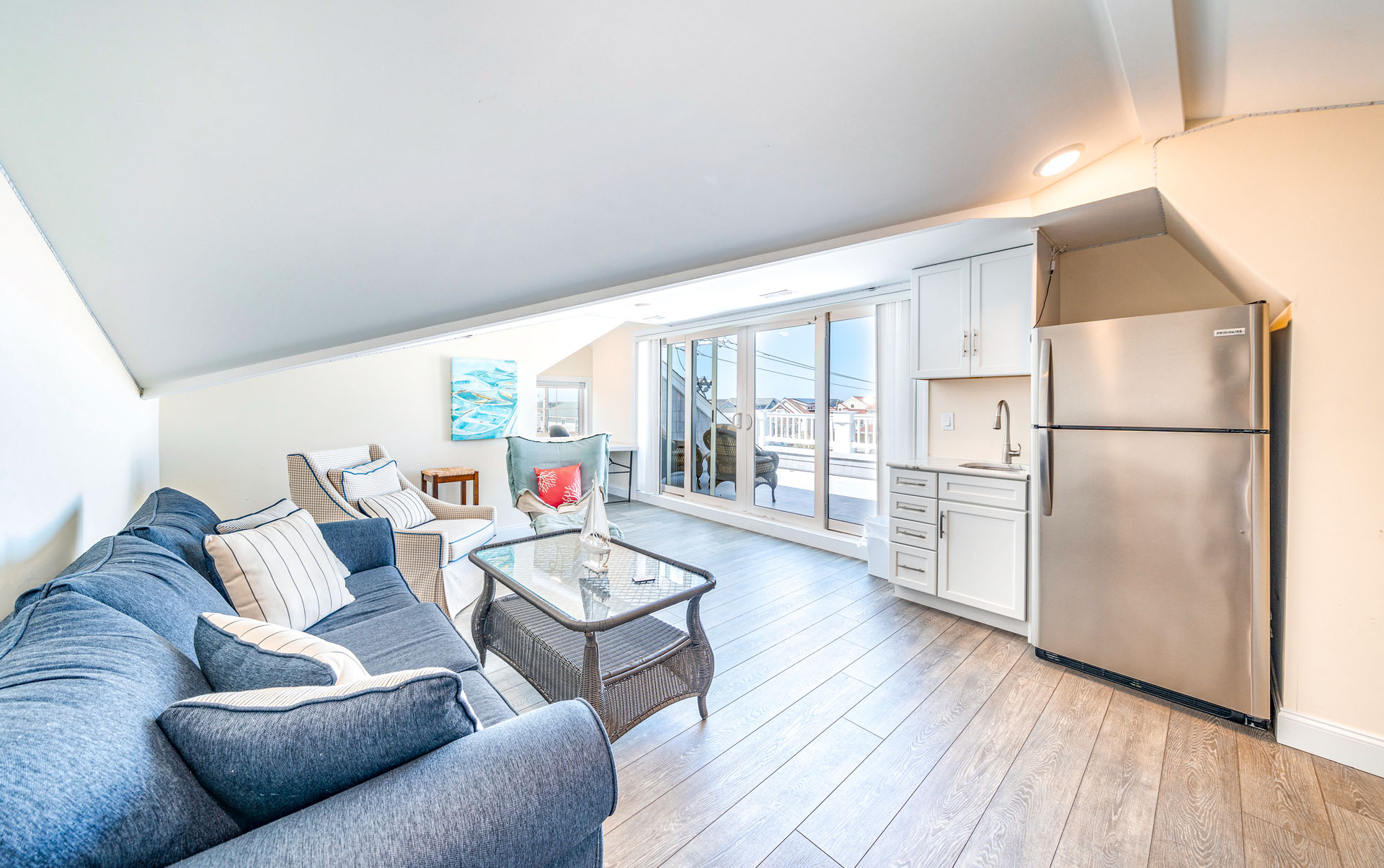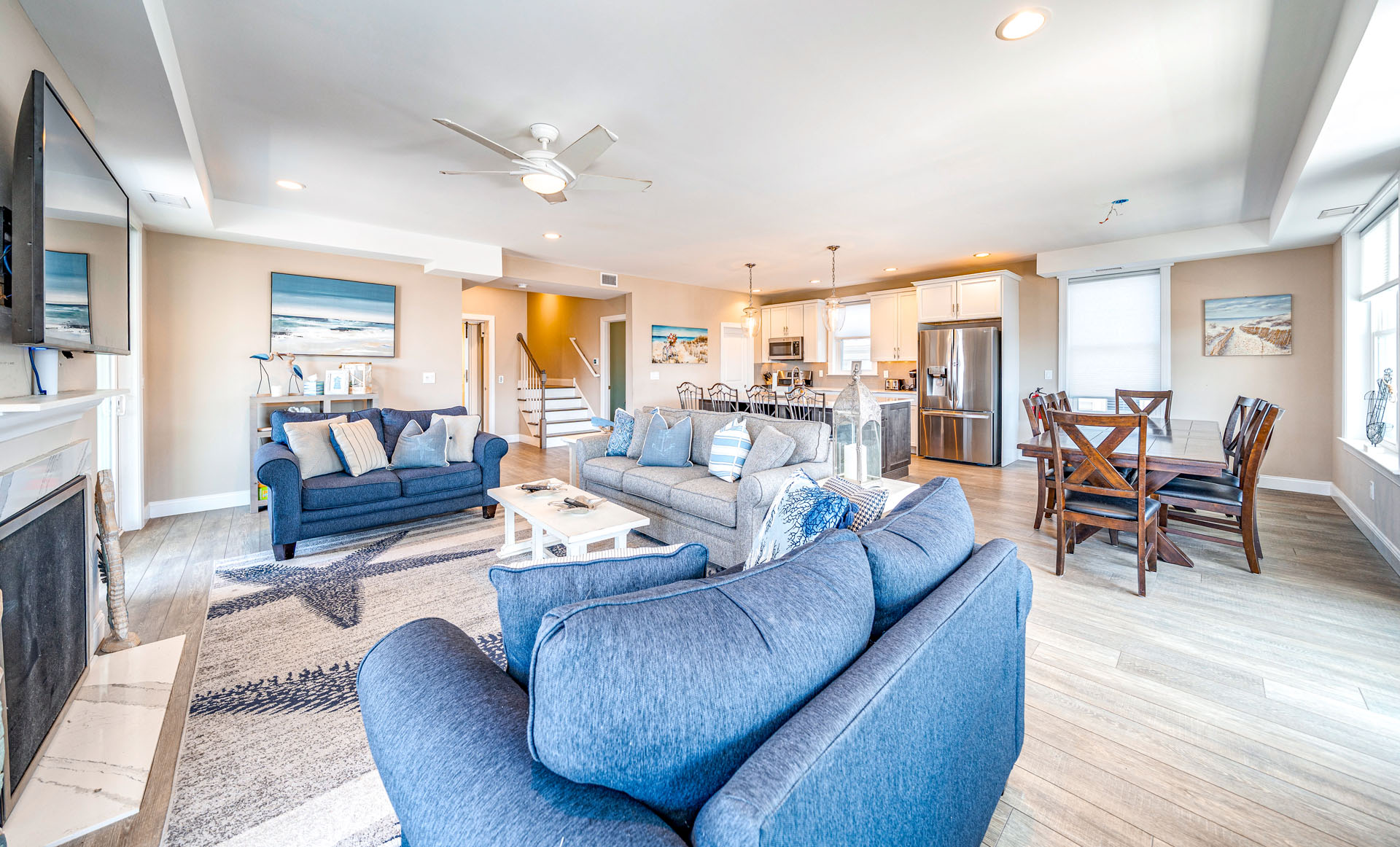 Spacious open-concept living/dining area w/ high ceilings & coastal décor